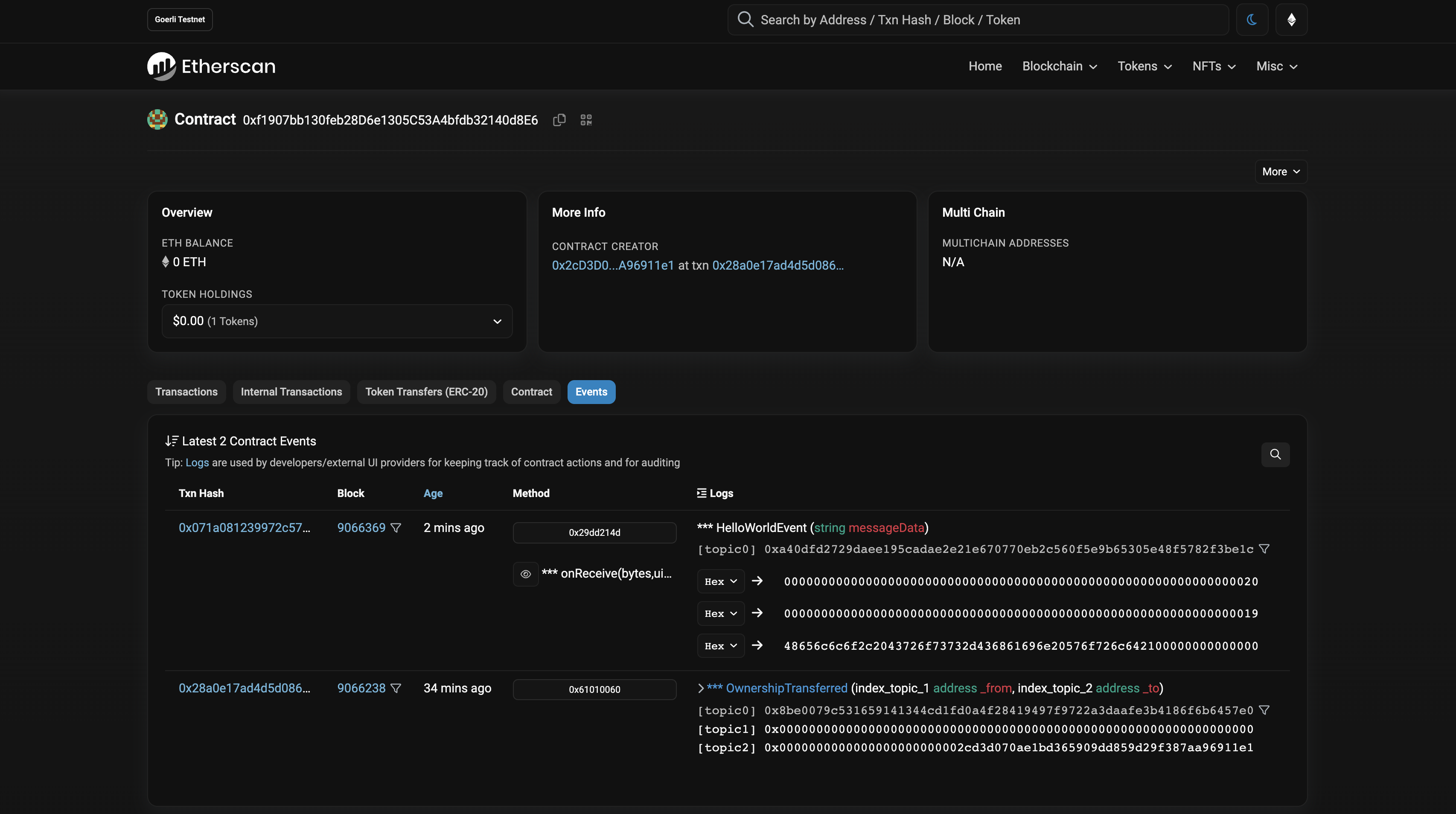 Send a message from BSC testnet to Goerli using the contract address (see the