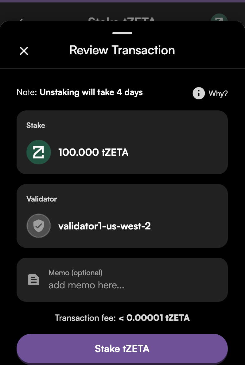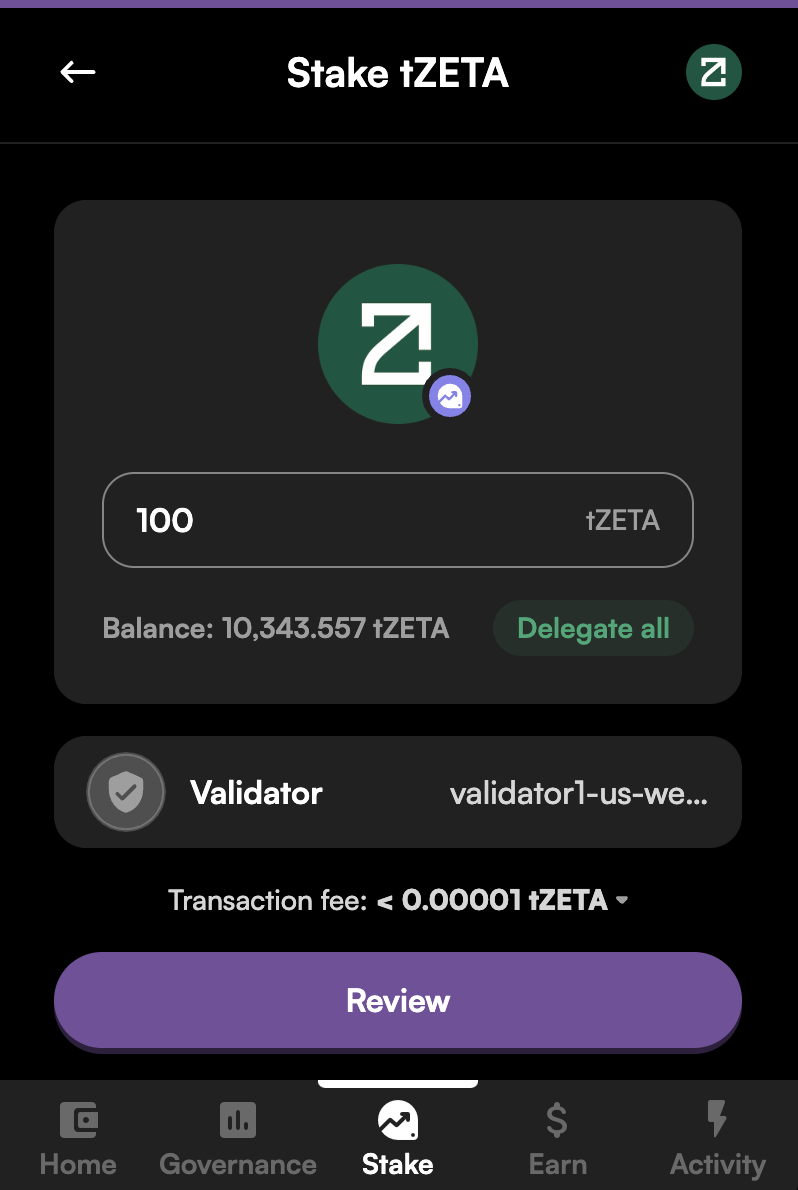 Enter the amount of ZETA you would like to delegate and click "Review":
