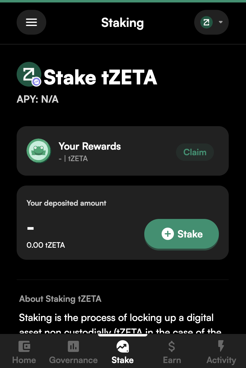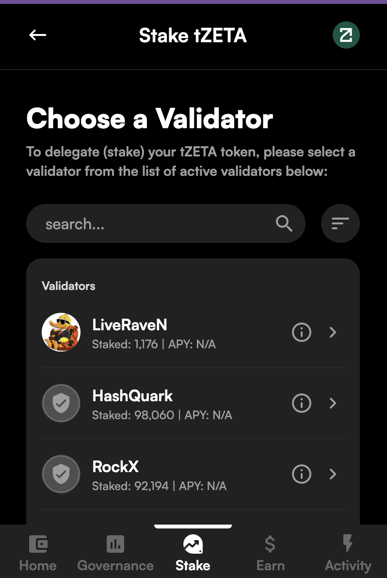 To delegate your ZETA tokens to a validator, select the "Stake" tag in Leap: