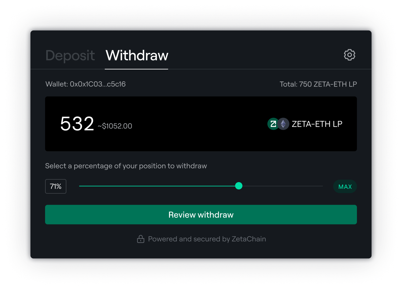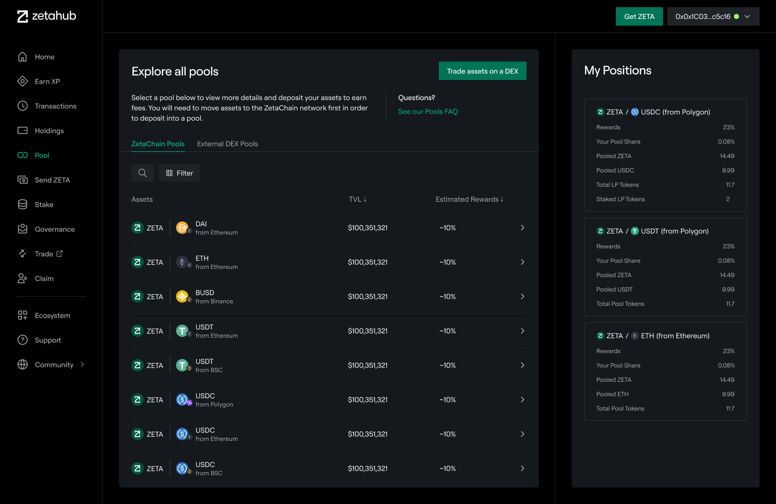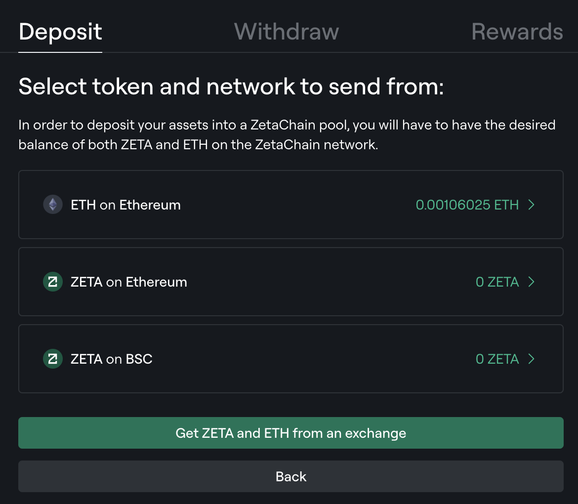 Once you get more assets from an external exchange and send to ZetaChain, or you send your existing assets from another network to the ZetaChain network, you’re ready to start. Follow ZetaHub’s step-by-step flow to deposit your assets into your pool of choice and start earning fees.