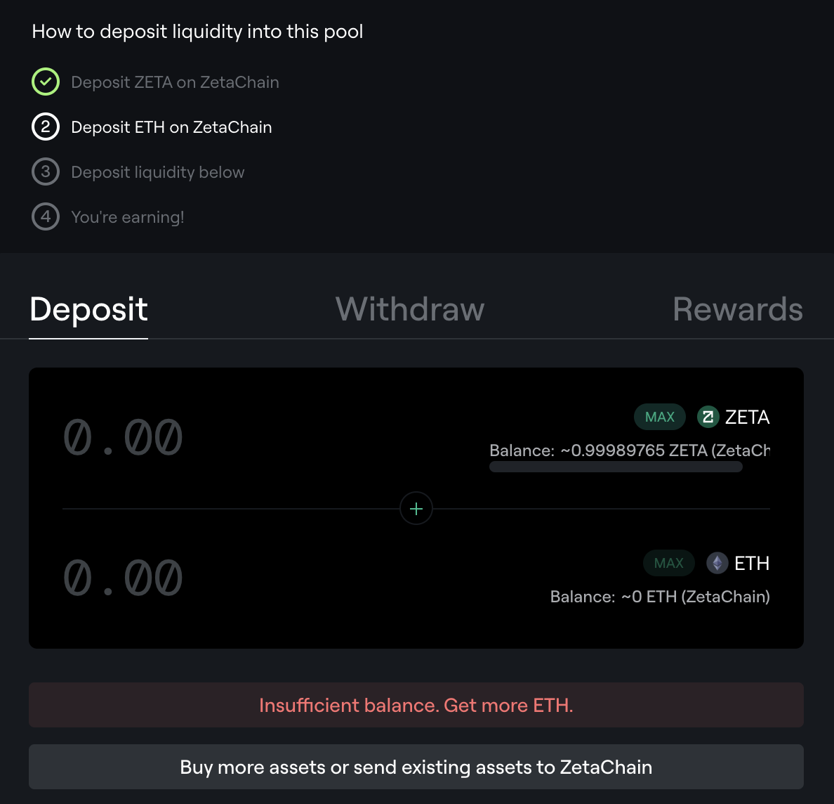 You’ll have to have a sufficient balance of both of the respective pool assets on the ZetaChain network in order to deposit into any ZetaChain pool.
