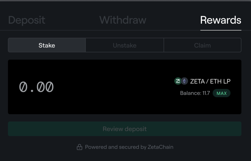 If you’d like to earn more rewards, you will be able to stake your LP tokens. After you’ve pooled your ZETA, check the “Rewards” tab in a specific pool, you’ll be able to stake the LP tokens you received from pooling. View your balance of LP tokens on the Rewards tab, and from there, you will be able to stake, unstake, and claim your rewards in each respective sub-tab.