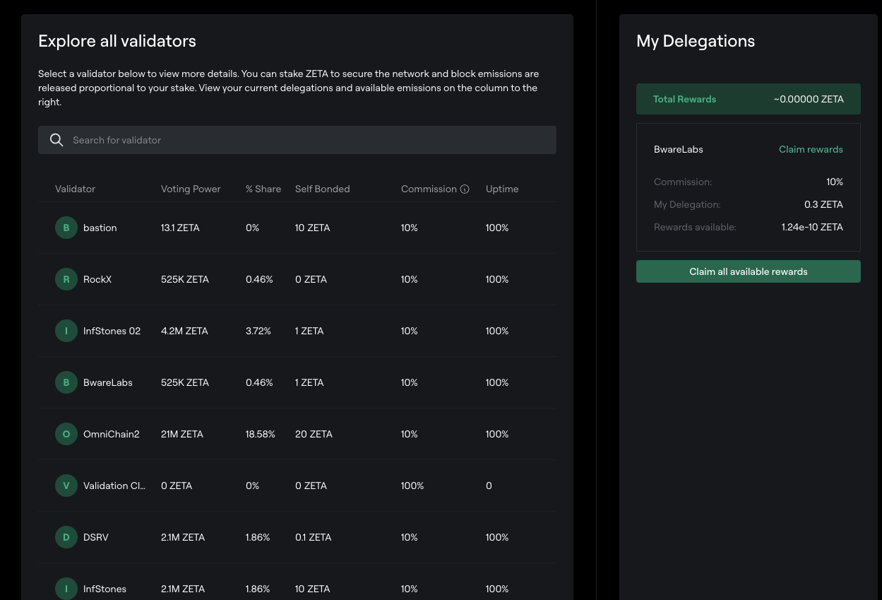 Once you’ve delegated your ZETA, you’ll be able to view all previous delegations in the right hand sidebar. You can also see and claim the rewards you’ve accumulated by clicking “Claim rewards” on a delegation card, or the “Claim all rewards” button at the bottom of the sidebar.