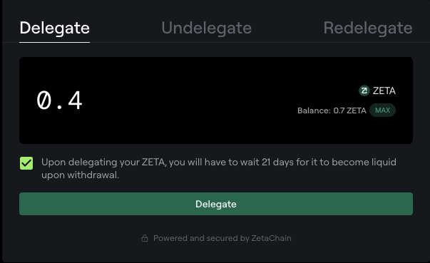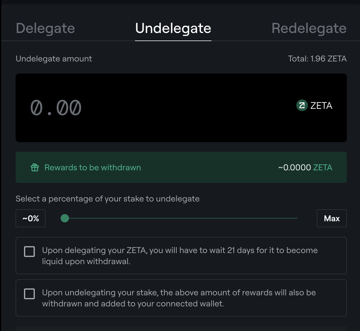 If you decide to undelegate your ZETA, you can head to the “Undelegate” tab within a validator’s page and input the amount of ZETA (and associated rewards) you’d like to take out. Note that you will have to wait 21 days before ZETA is liquid upon withdrawal.