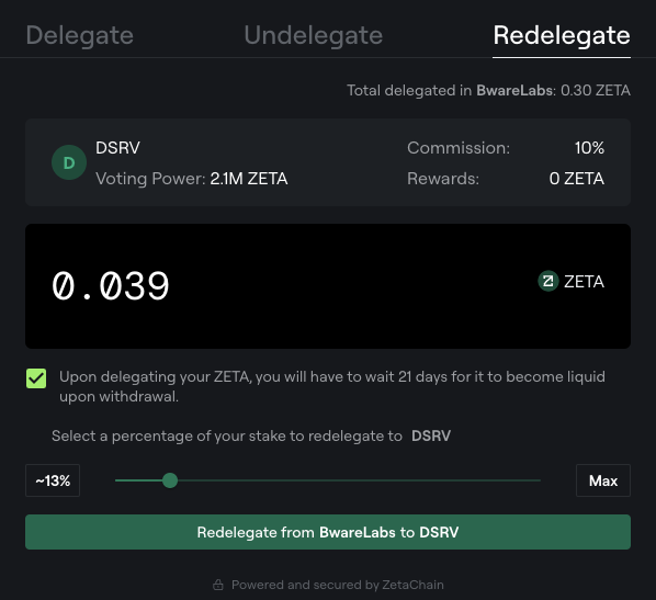 The Redelegate tab is for if you’d like to take out ZETA delegated to one validator and easily delegate it to another validator of your choice. Select the desired new validator and start the delegation process as normal.